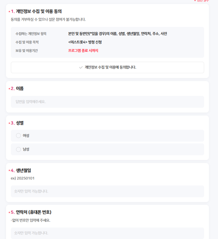 해당 폼에서 이름, 성별, 생년월일, 연락처 등을 입력해 제출하면 신청 완료됩니다.